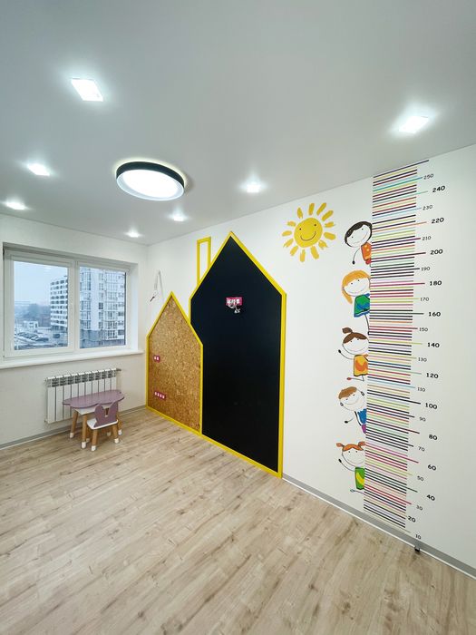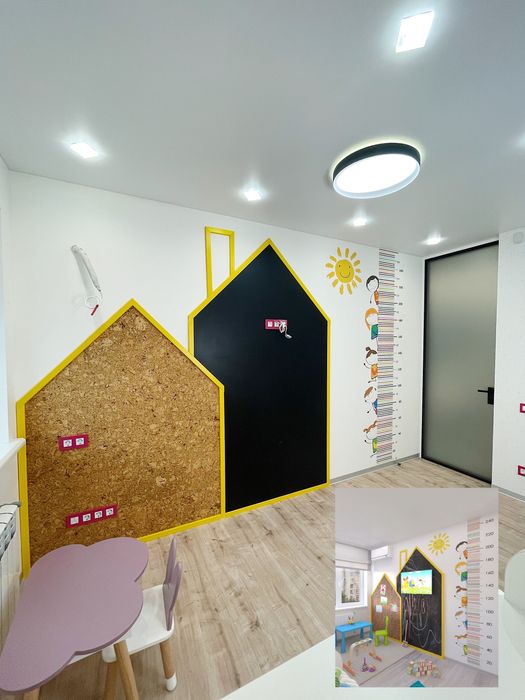 •Декоративные домики. 1 дом с пробковым покрытием, 2 дом с грифельной доской для рисования (на крыше дома - место для TV зоны)