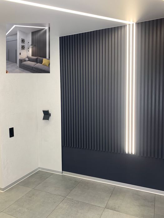 •Декоративная стена с рейками и LED подсветкой переходящей на потолок