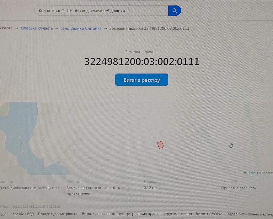 Продам земельну ділянку в с. Велика Снітинка ( Большая Снитынка); Продам земельну ділянку в Фастівсь кому районі Київської області (с. Велика Снітинка) 12 соток. Садове товариство Великоснітинське-2011. Ділянка правильної форми, рівна. Гарний чернозем. Недалеко озера. Електрика по фасаду. Ціна за всю ділянку. Ділянка знаходиться між селами Велика Снітинка і Фастівець.