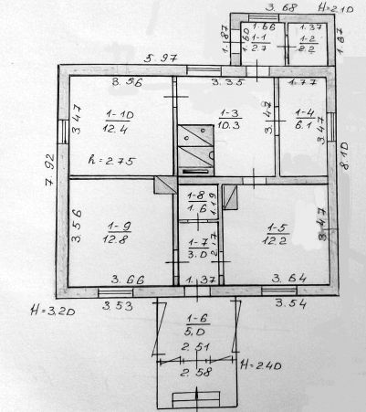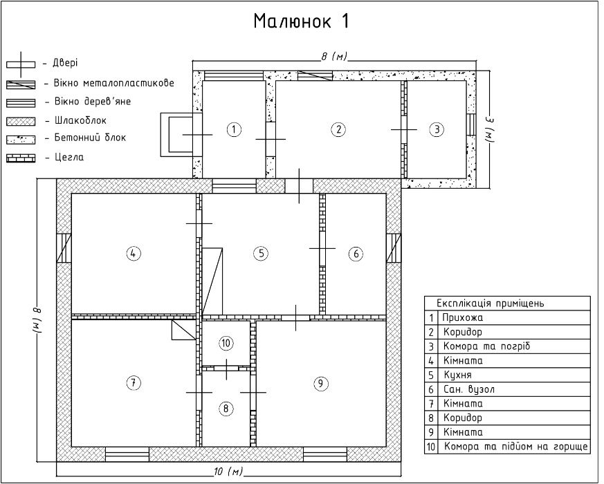 Будинок одноповерховий площею 68,3 м.кв. за документами, фактична площа будинку з прибудовою складає 101 м.кв. Будинок газифіковано, проведено водопостачання та каналізацію, обкладено пінопластом. Додаткова інформація про будинок відображена на малюнку 1.