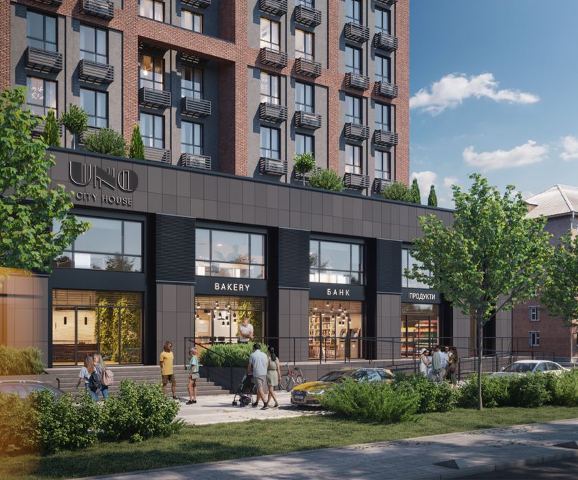 На перших двох поверхах розміщено магазини, салони, банки, аптеки тощо.