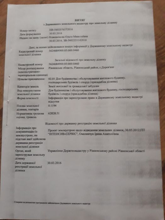 Земельна ділянка 0,12га Дерев'яне; Продам земельну ділянку під будівництво 0.12Га, с. Дерев'яне (біля Клевання) приватизована. Кадастровий номер 5624684900:05:000:0460