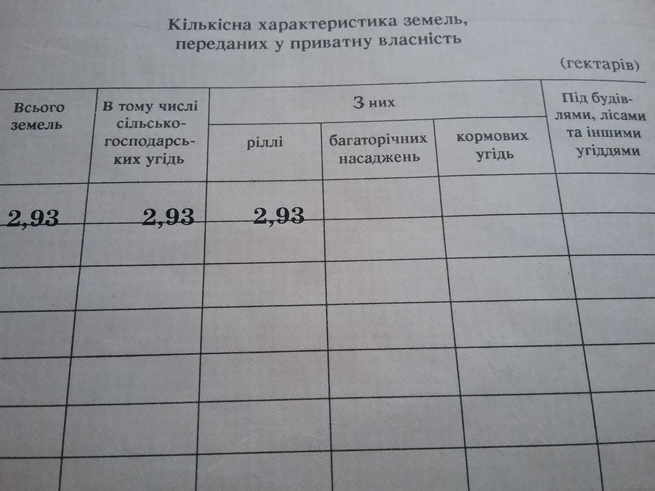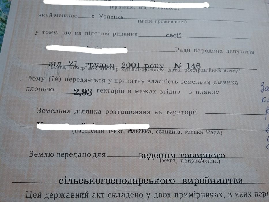 Продам земельный пай 2.93га,15км от города Кременчуг Полтавской обл.; Продам земельный пай 2.93га, 15км до города Кременчуг Полтавской области. Цена за 1 га. Рядом проходит автомобильная трасса Киев - Днепр, рядом находится село Успенка Олександрийского района(Онуфриевского района) Кировоградской области, рядом речка Днепр(правый берег Днепра). Земля сельскохозяйственного назначения, обрабатывается каждый год. Государственный акт на право собственности, кадастровый номер присутствует. Собственник, все документы на руках. В аренде до 31 декабря 2026 года. Все дополнительные вопросы и предложения по сути продажи земельного участка по телефону или на сайте. Оформление сделки за счет покупателя .; кадастровий номер: Присутствует.