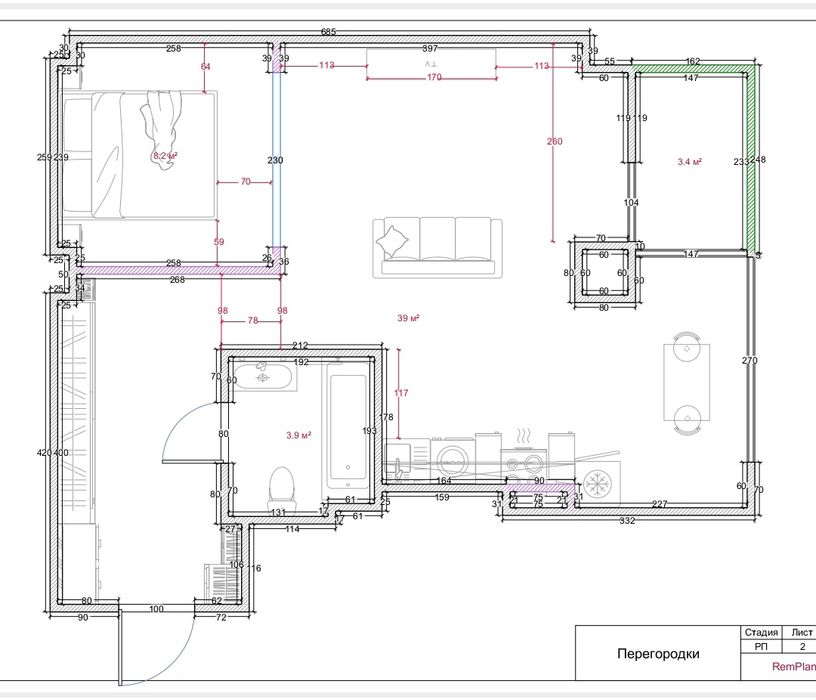 Мебель: двуспальная деревянная кровать с ортопедическим матрасом, диван не раскладной, встроенные шкафы, кухонная мебель, стол, стулья, табуреты. Два одеяла, две подушки, покрывало, гладильная доска, раскладная сушилка для белья.