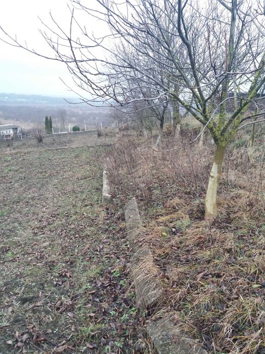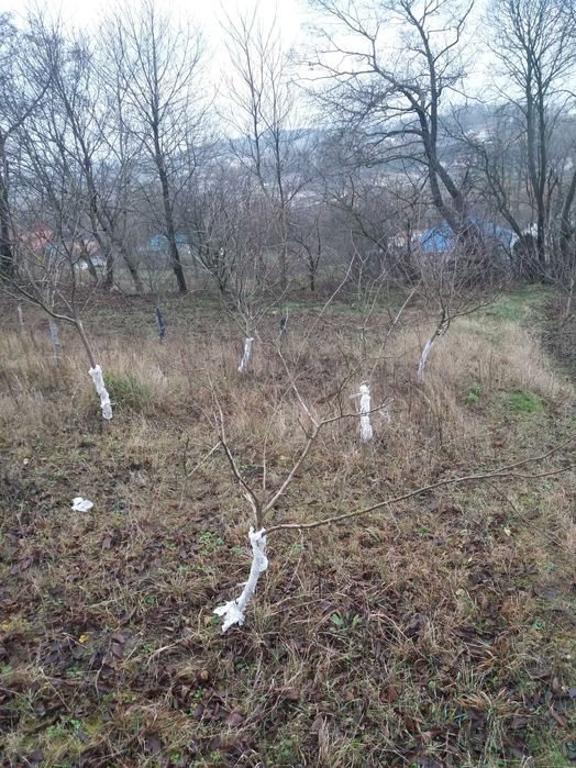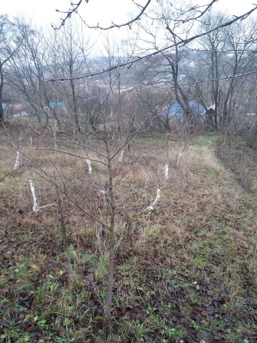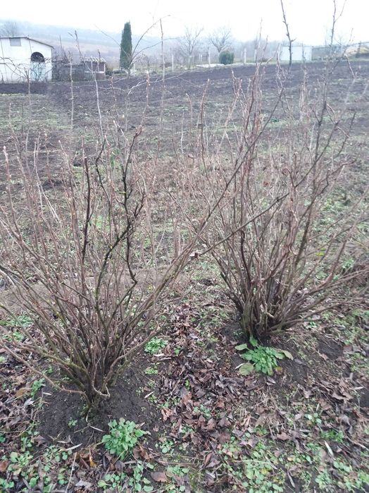 Є фруктовий садок, кущі порички та смородини.