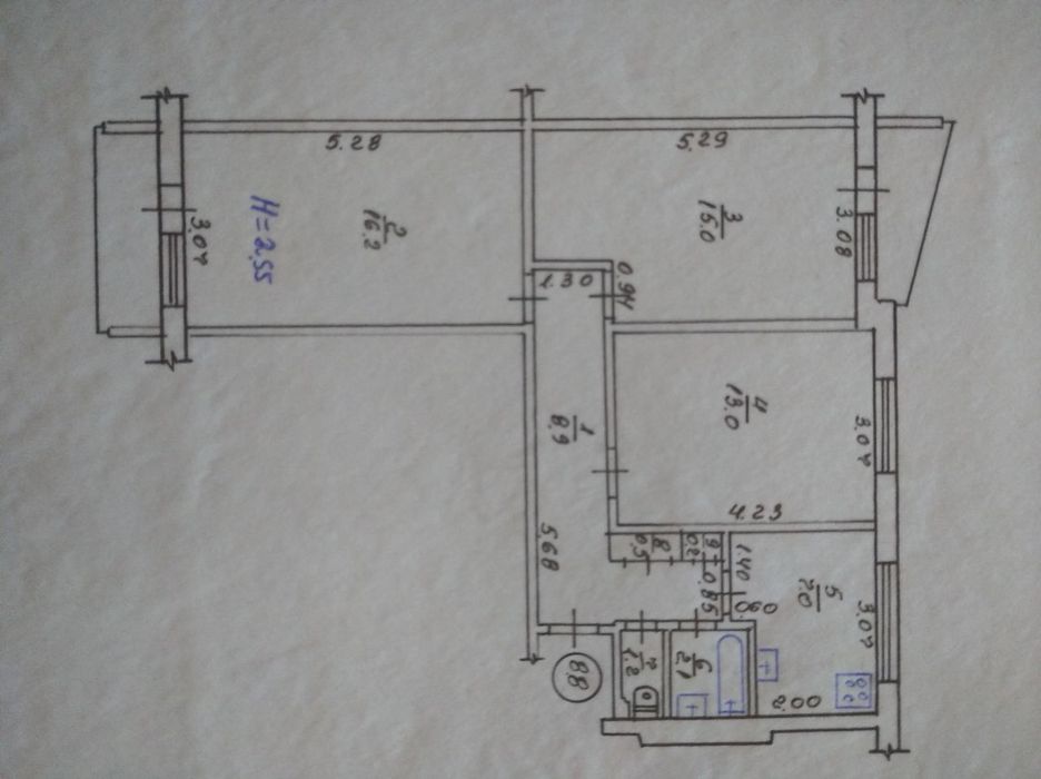 3 комнаты,2 балкона,совмещённый санузел