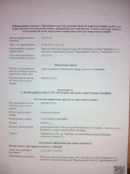 Земельна ділянка; Продам земельный участок под строительство по ул.Шевчукевича (р-н ул Коломыйской). Площадь 5,45 соток. Приватизированный, все документы в наличии. Подведено городское водообеспечение, есть городской проэкт электрификации района. Участок находится в городе