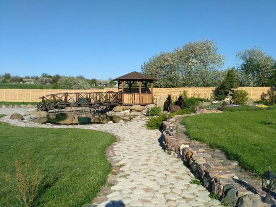 Баня оформлена в стародавнем украинском стиле. Площадь общая 130 кв.м. Бассейн (8,3м х 3,3м), зона барбекю, ставок (6м х 15м) с водопадом, продуманное ландшафтное озеленение, красивые хвойные деревья, березы. Все подмостки и дорожки вымощены тратуарной плиткой «Старый город». Установлены дополнительно бензиновый генератор, двух-тарифный счетчик электроэнергии. Два въезда на участок - со стороны основного дома, со стороны бани. Дом строился для себя качественными материалами, окна мет/пласт. Rehau, соблюдены все стандарты безопасности постройки (баня со спец. пропиткой). нормы пожарной безопасности (по комнатам, в бане, в доме расставлены огнетушители, возле крыльца бани выведен кран с водой и шлангом). Видеонаблюдение по всему периметру участка и внутри. Вокруг зданий установлены прожектора и датчики включения на движение, продуманное внешнее и внутреннее освещение. Все помещения оснащены сигнализацией, датчики на движение, действующий договор с ГСО. Спутниковое ТВ, интернет. Канализационная система состоит из двух отдельных стоков – для основного дома и отдельно для банного комплекса. На участке своя скважина 46 метров, колодец (в настоящее время не используется). Вокруг территории участка высокий кирпичный забор, для домашнего любимца собаки есть вольер. Шикарная природа, хвойный лес.
