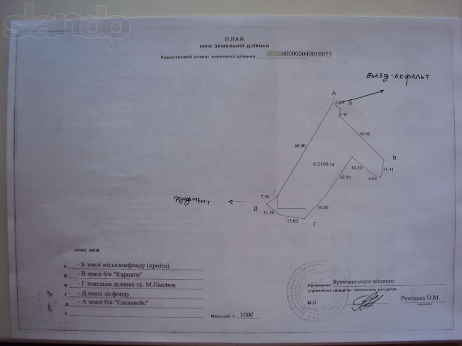 продается земельный участок 0,21 га в центре Яремче; Продается земельный участок 0,21 га в центре Яремче.Участок граничит с б/о "Карпаты"и с б/о "Эдельвейс".К участку подходит асфальтная дорога ,все коммуникации.Собственность.На участке фундамент 10,200Х16,000. Гос.акт ,разрешение на строительство телефон на вайбере тот же.Цена указана за сотку