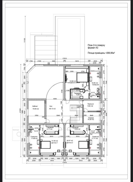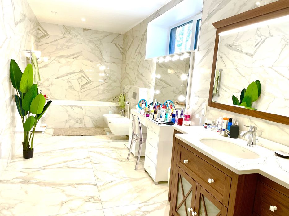 1 хозяйская спальня с камином и санузлом; две одинаковые спальни со своими санузлами, во всех санузлах душевая и ванна, большая гардеробная, прачечная, кабинет, большой холл с библиотекой.