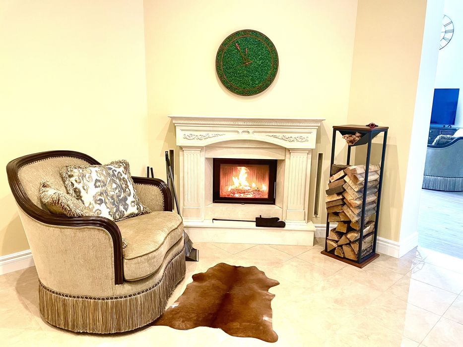 Гардеробная, две гостевые комнаты, гостевой санузел с душевой, просторный холл с камином, кухня/гостиная с камином Romotop, панорамные окна, сауна, тренажерный зал, котельная, мастерская, гараж на два авто со входом прямо в дом.