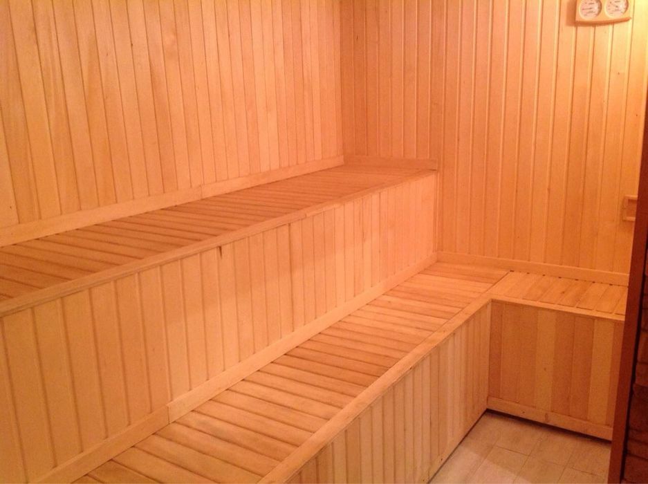 Построен большой банный комплекс 160м² с жилым помещением и гаражом. В обьявлении выставлены фотографии внутренней отделки банного комплекса.