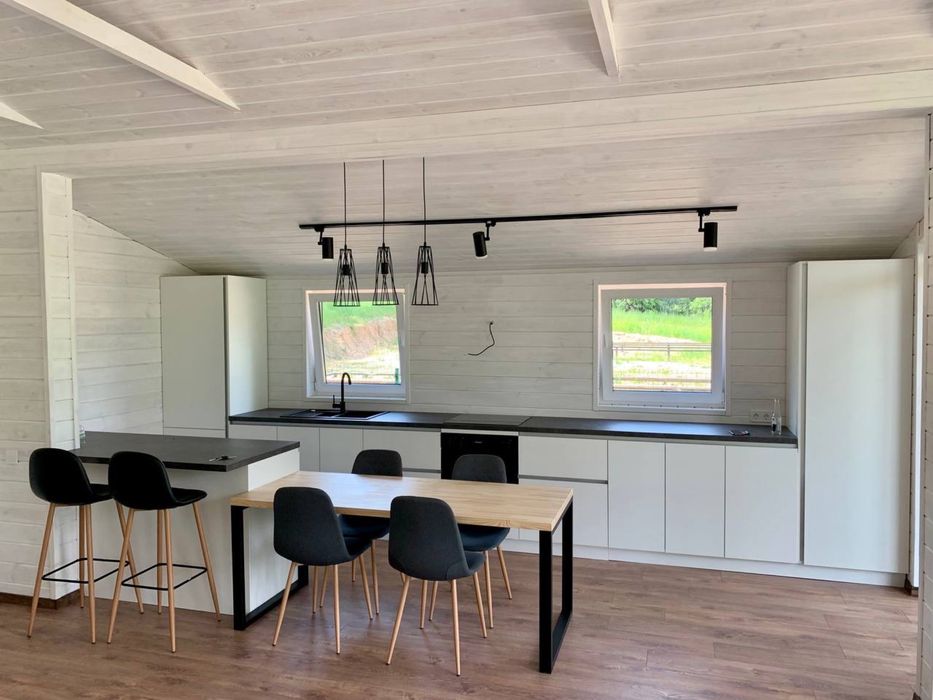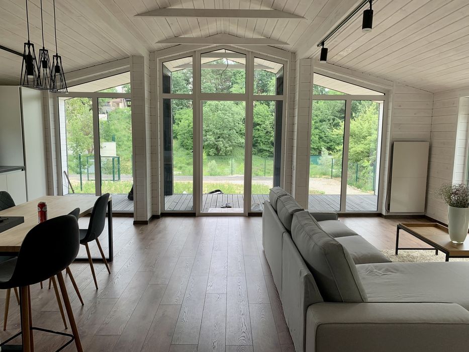 Аренда будинку з генератором та з альтернативним опаленням; Здаються 2 нових будинка, що розташовані поруч у Лісниках з панорамним краєвидом у стилі Скандинавський мінімалзім. У кожному будинку 2 спальні, санвузол, велика вітальня и кухня, велика тераса. Генератор 5 КВт та камін для обогріву. Уся побутова техніка та меблі нові. Здається уперше.