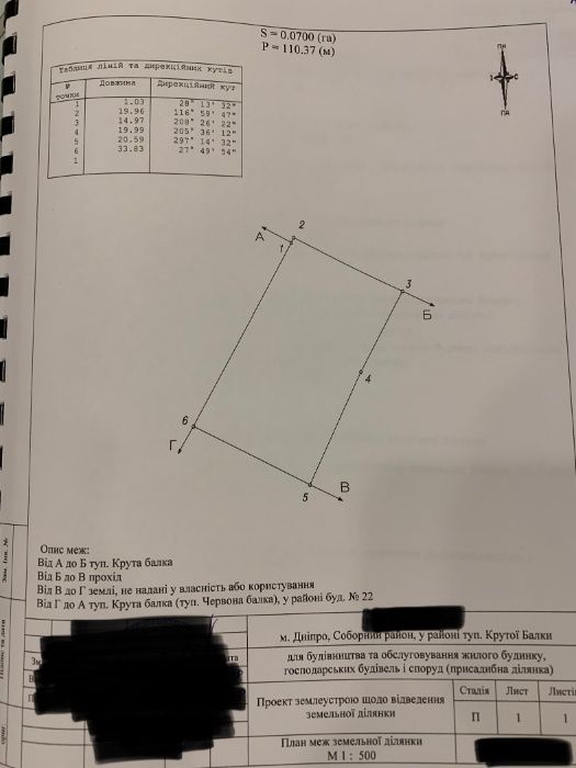 Соборний; Продам земельный участок; Продам приватизированный земельный участок "Для будівництва і обслуговування житлового будинку, господарських будівель і споруд (присадибна ділянка)" по адресу: туп. Крутой балки, Соборный (Жовтневый) район города Днепр, площадью 7 соток.