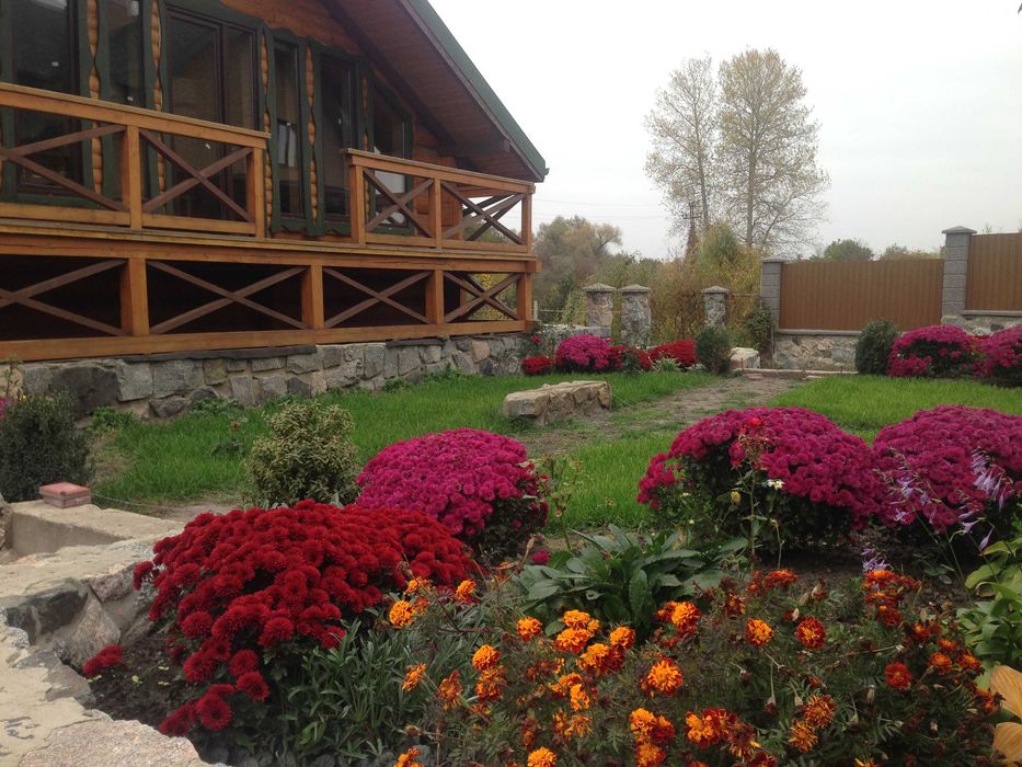 Ділянка 0.20 га огороджена красивим парканом: від дороги із бутового каменю висотою 2 м, по всьому периметру двору з металопрофілю під дерево зі стовпцями під камінь. Розташована ділянка на схилі дуже вдало, має два рівні: на першому – двір иі два будинки, на другому – молодий сад, місце для альтанки, ландшафтна зона і баня с виходом на луг до річки.