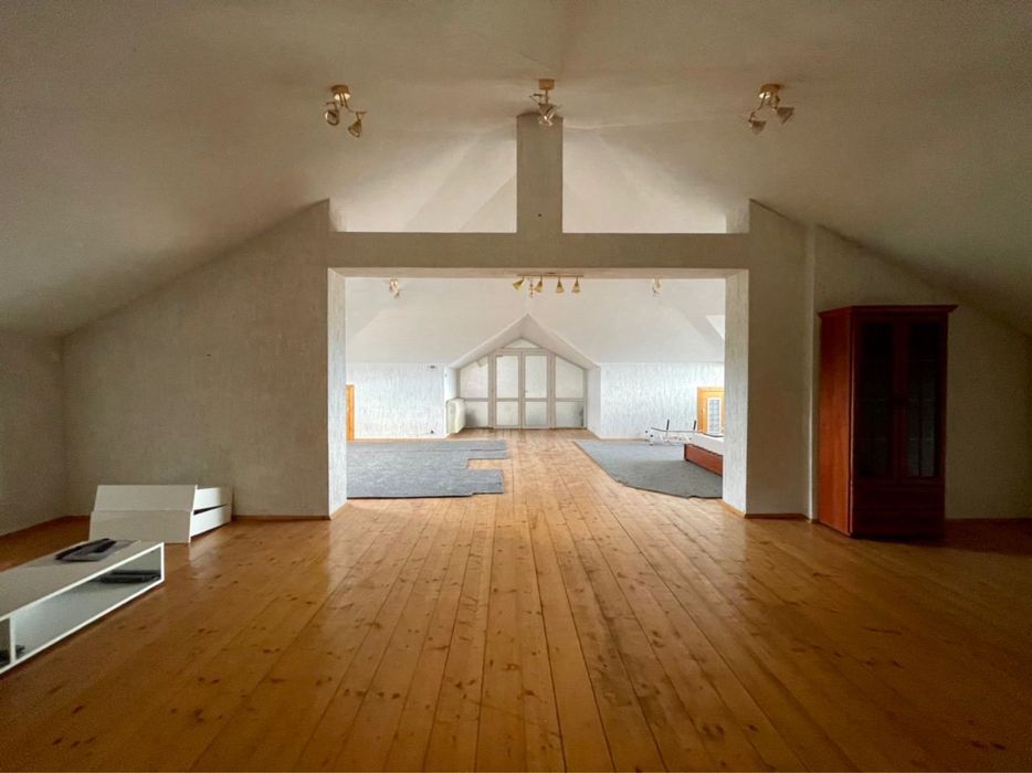 Просторная комната с мансардными окнами, можно использовать как спортзал, бильярдную, кинозал или же игровую для детей