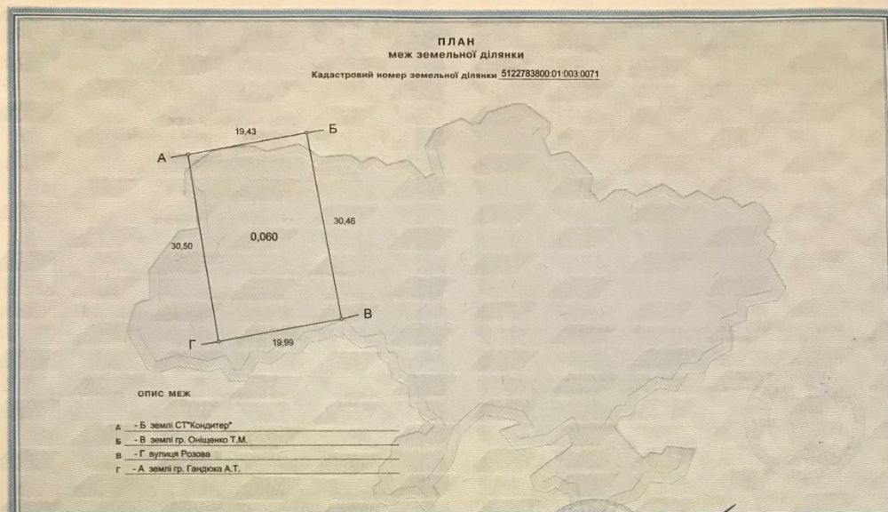 К участку подведен водопровод и свет; кадастровий номер: 5122783800:01:0034:0147