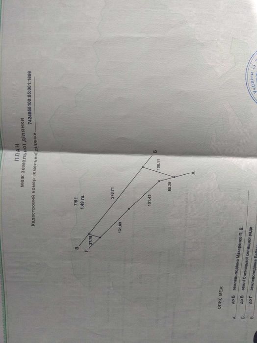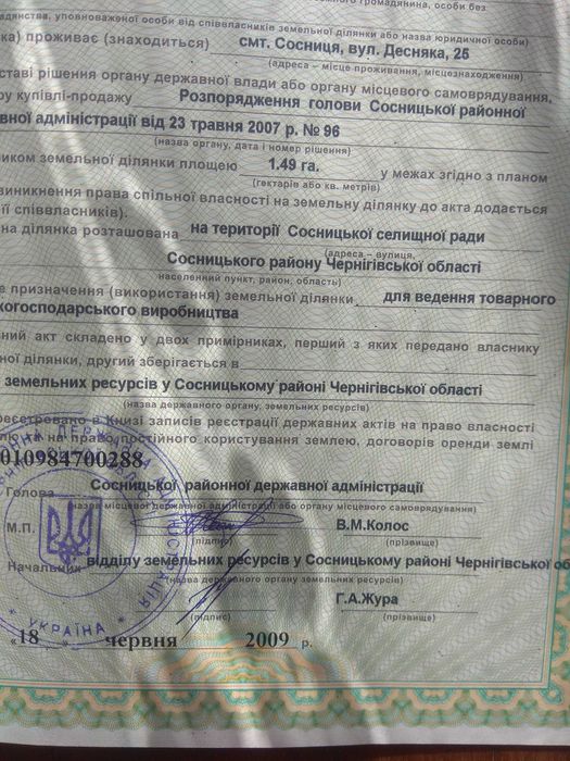 Земельна ділянка площею 1.49 га.; Земельна ділянка площею 1.49 га. Земля для ведення товарного сільськогосподарського виробництва- так записано в державному акті. Але всі навколо вже використовують під ріллю. Не в оренді. оформлення за ваш рахунок.