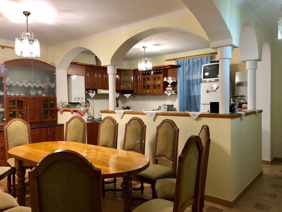 Дубова частина (міжкімнатні двері, сходова клітина, барна столешниця, міжкімнатні арки, стіл + 12 стільців)