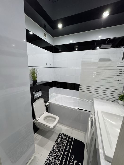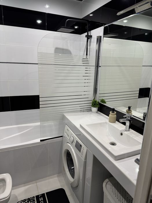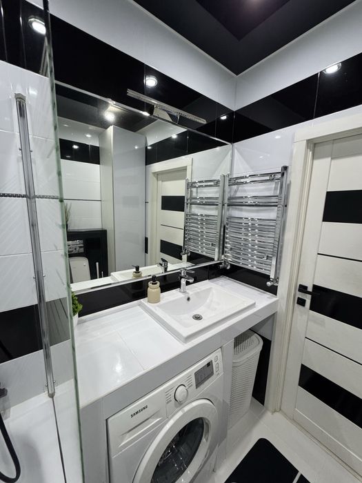 Ванна кімната обладнана сучасними сантехнічними приладдям та має усе необхідне для комфортного перебування. У ванній кімнаті є душова кабіна, умивальник унітаз пральна машина та великий шкаф.