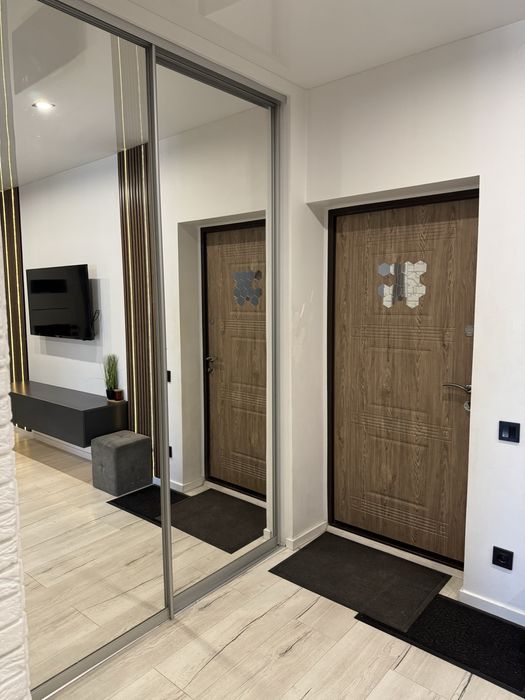 Власна гардеробна 4м2 з велики дзеркальними розсувними дверима.