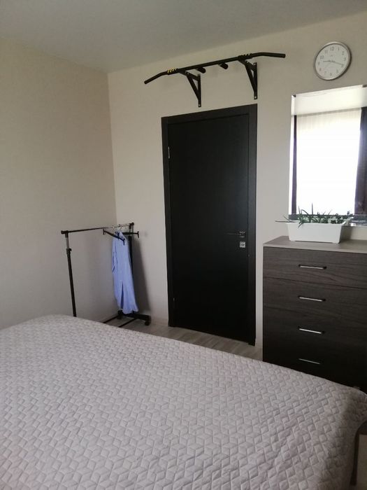 В спальне есть огромная новая кровать (2.1м. на 2.1м., новый матрац Neolux 3D AERO), 2 тумбочки, шкаф-пенал, комод. Вся перечисленная спальная мебель сделана и установлена из дорогих и качественных ДСП в январе 2022 года. Кровать с независимым отдельным железным разборным каркасом (под заказ), современный удобный ортопедический матрац по спецзаказу нужного размера. Установлен турник для тренировок.