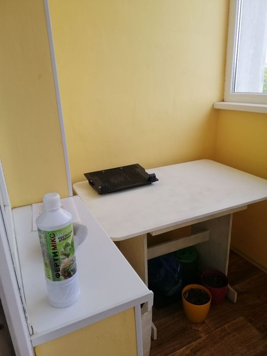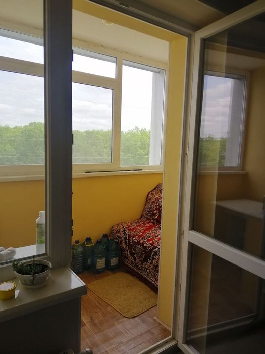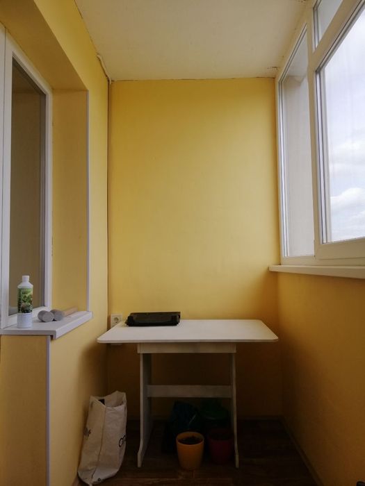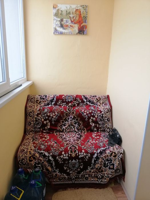 При покупке балкон был полностью открытым. Теперь есть полы, застеклен, покрашен дорогой моющей краской, а ТАКЖЕ утеплен с ВНЕШНЕЙ стороны дома, куплен новый диванчик раскладной (можно без проблем спокойно спать взрослому). На фото на диване накидка, а так он песочного теплого уютного цвета.