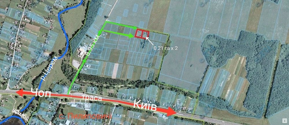 Відстань від траси Київ-Чоп до 1км, під'їзд до ділянок може бути облаштовано з любої паралельниї вулиці дивіться фото.