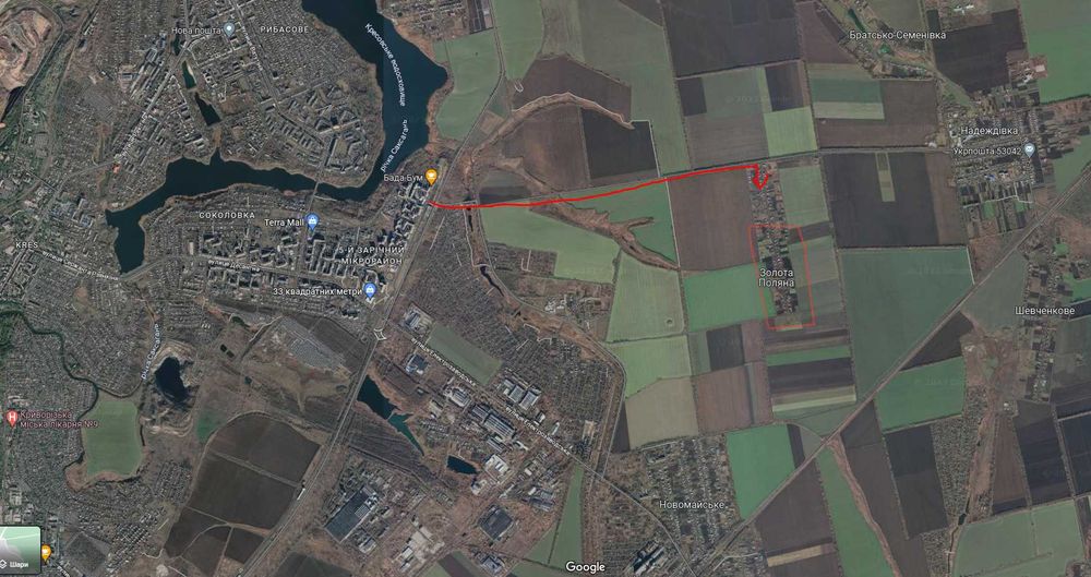 Віддаленість від міста 3 км. Кінцева зупинка швидкісного трамваю "Кільцева" від села ходять маршрутки кожні 30 хвилин.