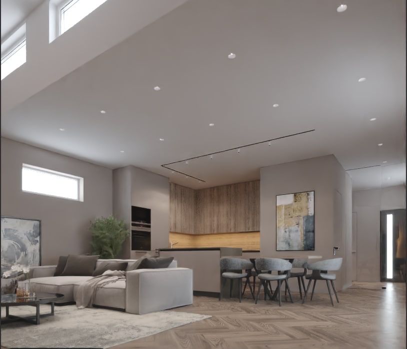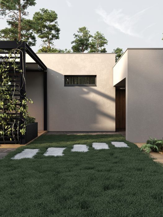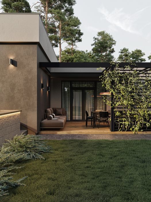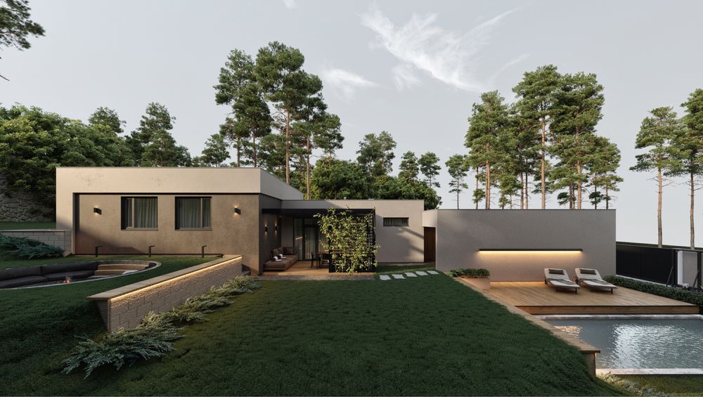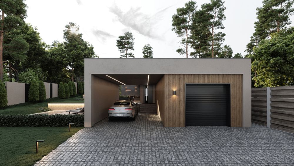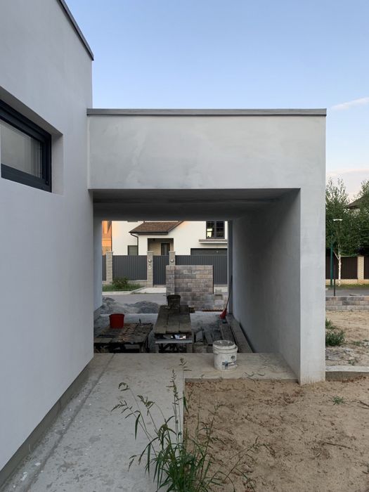 - будинок побудовано у трьох рівнях. Перший - гараж, навіс. Другий рівень - гостьова, тамбур, санвузол, котельня. Третій рівень - спальня, дитяча, кабінет, гардеробна, санвузол