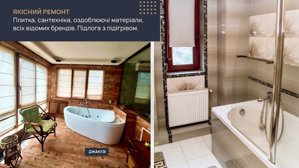 Другий поверх: дві кімнати для відпочинку, кожна кімната має окремий вихід на балкон, сан. вузол з ванною. Додатково в господарській спальні відокремлено зону для SPA!