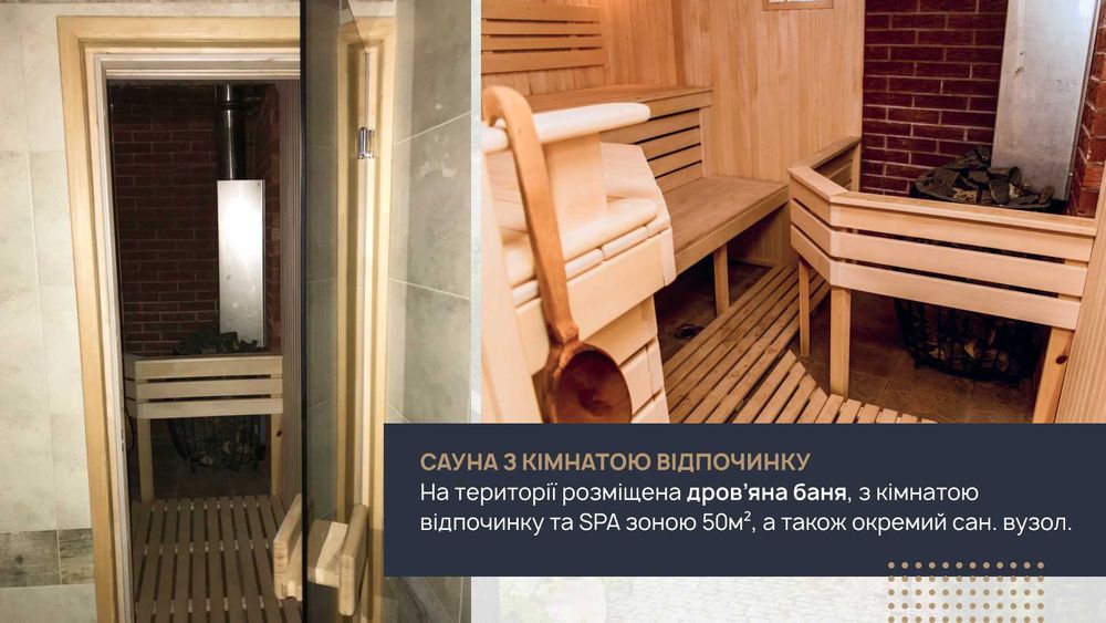 На території розміщена дров'яна баня, з кімнатою відпочинку та SPA зоною 50м2, також окремо сан. вузол.