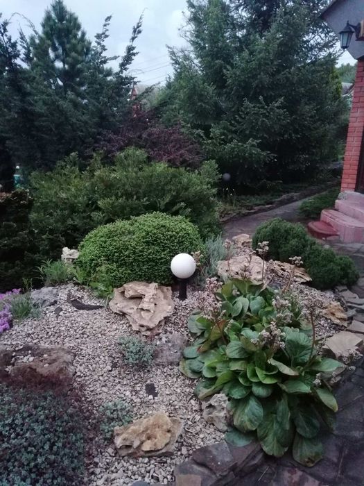 Территория вся облагорожена хвойными растениями и газонной травой, декоративными цветами и альпийскими горками. Дорожки выполнены из натурального камня.