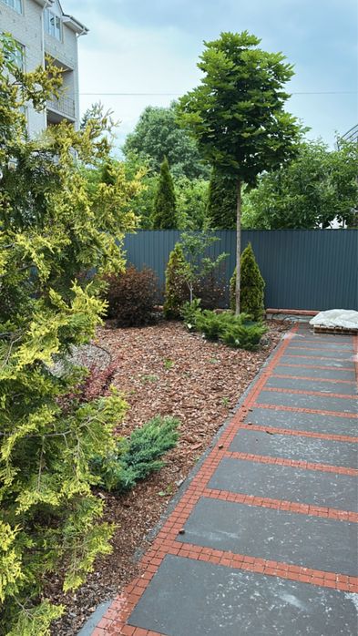 Сакури, магнолії, гортензії, троянди, туї, клени, бузок, газон, автоматичний полив.