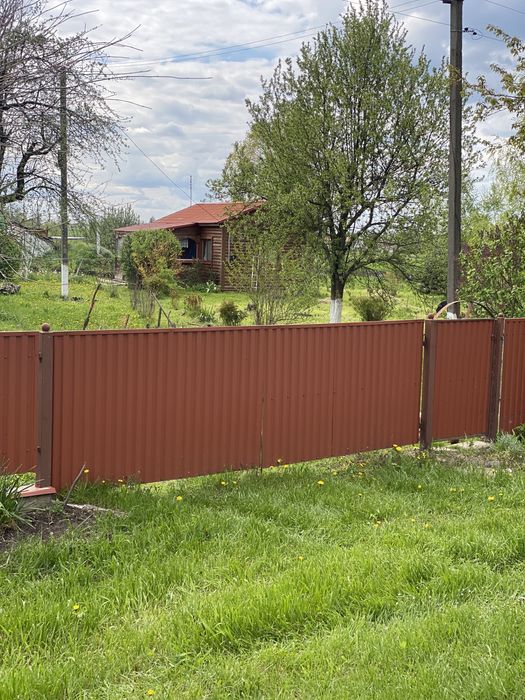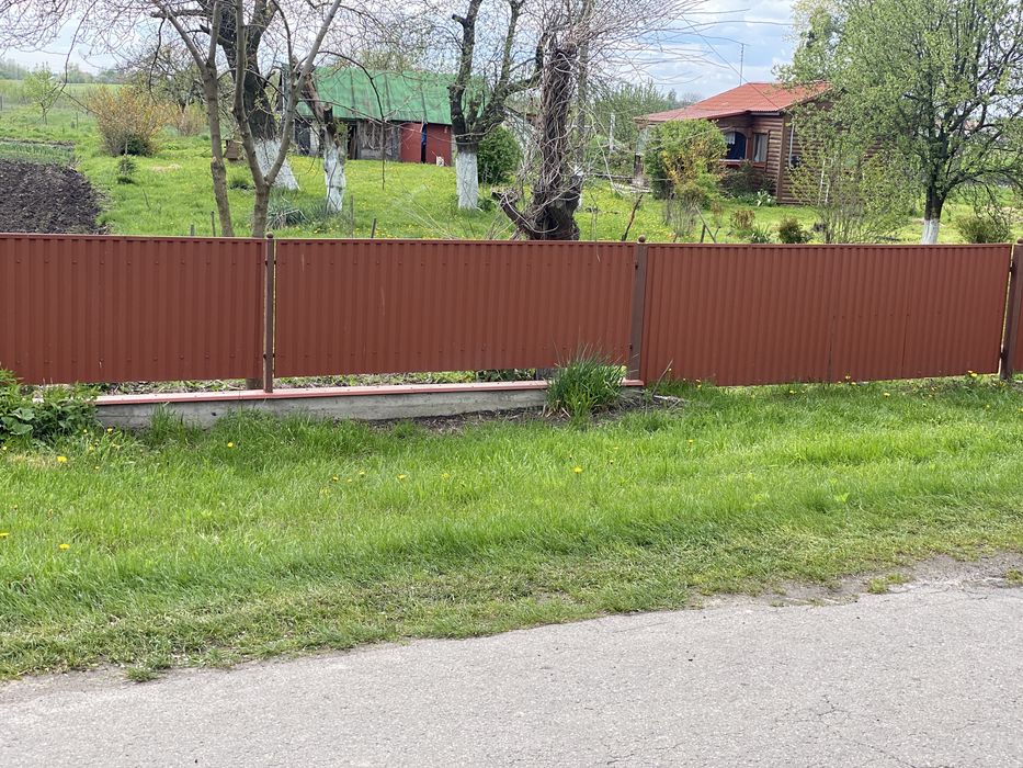 Паркан із сітки - 300 м, 1.5 м заввишки з дроту в пластмасовій плівці через кожні 3 м - металеві стовпчики - 100 шт із заглушками. Ворота і хвіртка з метало-профілю.