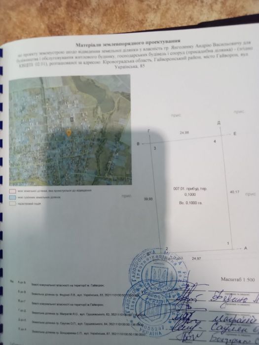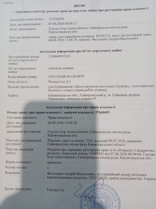 Продам земельну ділянку в екологічному місці, 10 сотих; Продам в екологічному місці приватизовану земельну ділянку площею 0,1 га (10 сотих) приватний сектор, за адресою вул. Українська 85, місто Гайворон, Кіровоградської області. На ділянці є готовий фундамент (цоколь, перекритий погріб), також є проєкт будинку для якого починалось свого часу будівництво. Неподалік земельної ділянки є ставок (водосховище). Документи всі в наявності (технічна документація, проект землеустрою, кадастровий номер).