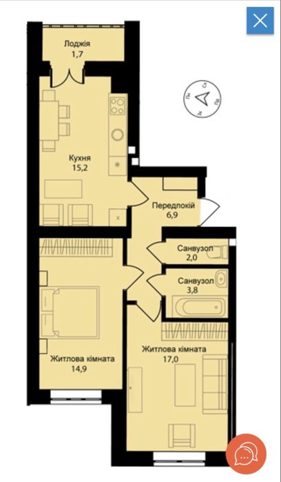 Загальна площа 61,5 кв.м., житлова 31 кв.м., кухня 15,2 кв.м. лоджія 1,7 кв. Автономне опалення, обладнане 2-х контурним газовим котлом. Стан від будівельників (без оздоблювальних робіт).