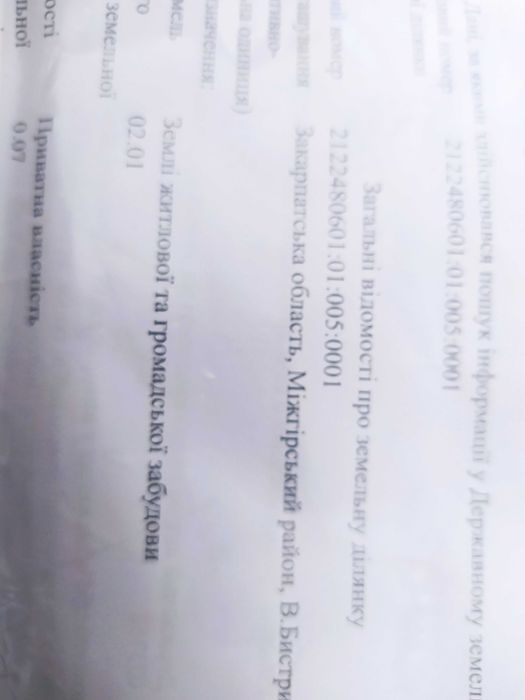 Земля під будівництво в горах; Продається приватизована земельна ділянка по вул.Миру в селі Верхній Бистрий Хустського р-н,з кадастровим номером , площею 0,07 га. Ділянка заходиться на невеликому підвищенні .без сусідів. До ділянки підведена електроенергія ,вода.Недалеко мінеральні джерела,лікувальні ванни,гірськолижний курорт "Пилипець",водограй "Шипіт",Синевирське озеро.Найближча ж/д станція Воловець.До центру села, 5 хвилин ходьби,де розташовані кафе та магазини.З ділянки відкривається краєвид на дві гірські річки -Ріка і Бистриця.Є нормальний зв"язок та інтернет,завдяки розташованій вежі Київстар- 300-400 м.; кадастровий номер: 2122480601;01;005;0001