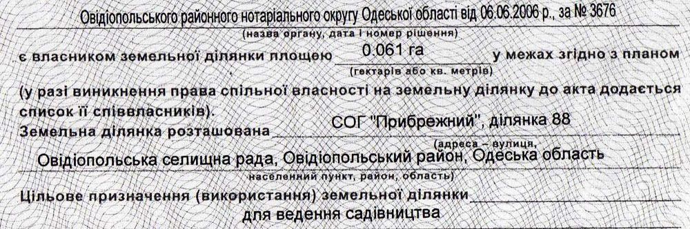 Адреса: Одеська область, Овідіопольський район, Овідіпольська селищна рада, СОГ "Прибрежний", діл. №88; кадастровий номер: 5123755100010030364