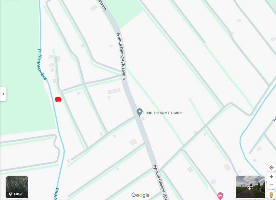 Заїзд у вулицю біля зупинки "На вимогу". Земельна ділянка 6,2 сотика, приватизована - наявний державний акт на землю. Два останні фото - місце розташування будинку позначено червоним кольором.