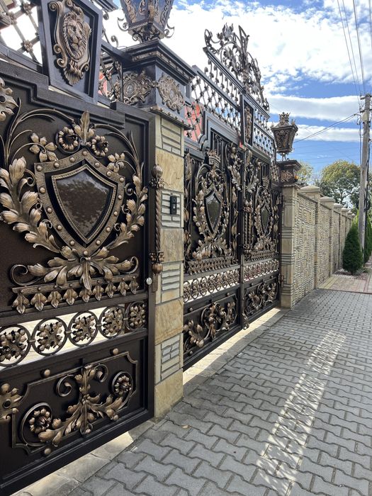 ковані ворота (на пульту) та калітка, забор з каменю, бесідка