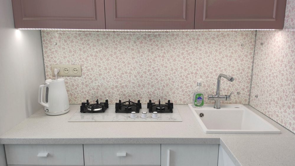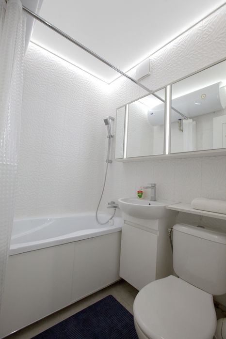 У цій квартирі ви отримаєте інстасвіт у будь-якій точці за рахунок led освітлення під полотном натяжної стелі, яскравість якого ви зможете регулювати за допомогою пульта.