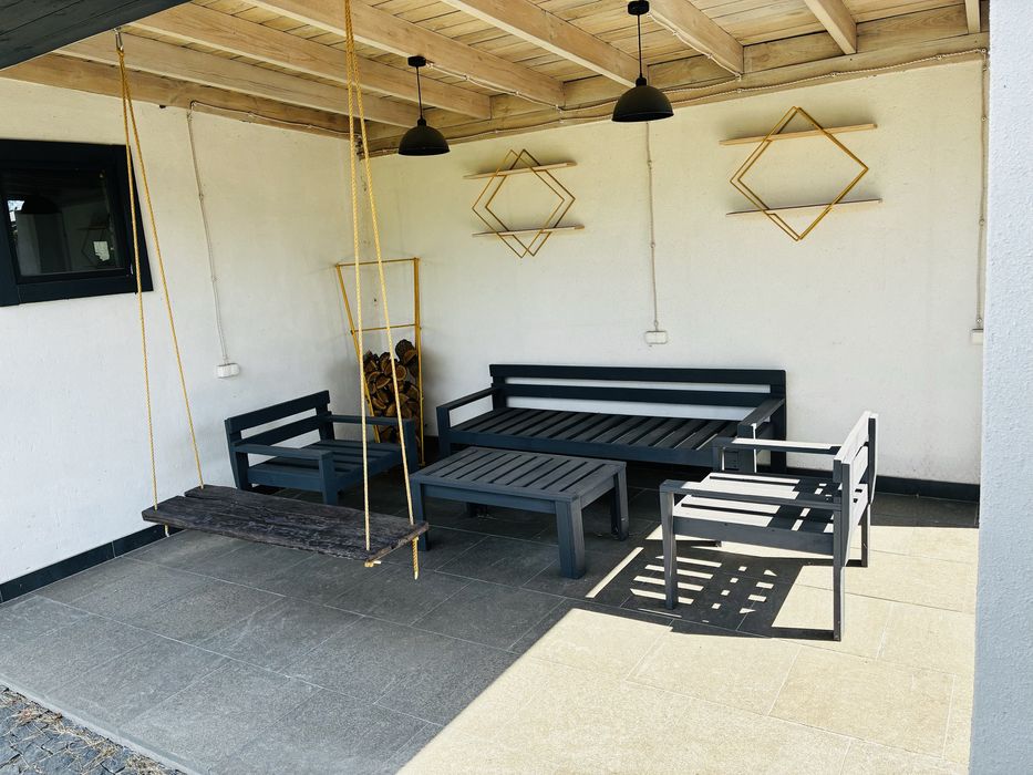 Простора зала с комином та шикарними алюмінієвими розсувними вікнами (від стелі до підлоги) яки виходять на простору терасу яка оздобленна натуральним гранітом і придають будинку бездоганний вигляд.. Є можливість використовувати дах, як зону відпочинку, висадити газон або облаштвати зону для гучних вечірок).для більш практичних там зручно встановити сонячні панелі.