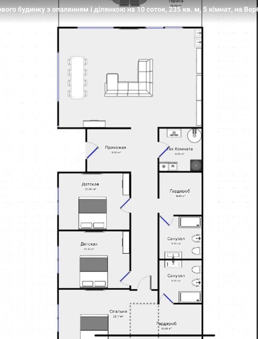3 спальни(по 20м2), 2 санузла(по 9м2), котельная(9м2), 3 гардеробные(по 9м2), гостиная (60м2), прихожая-коридор(25м2).
