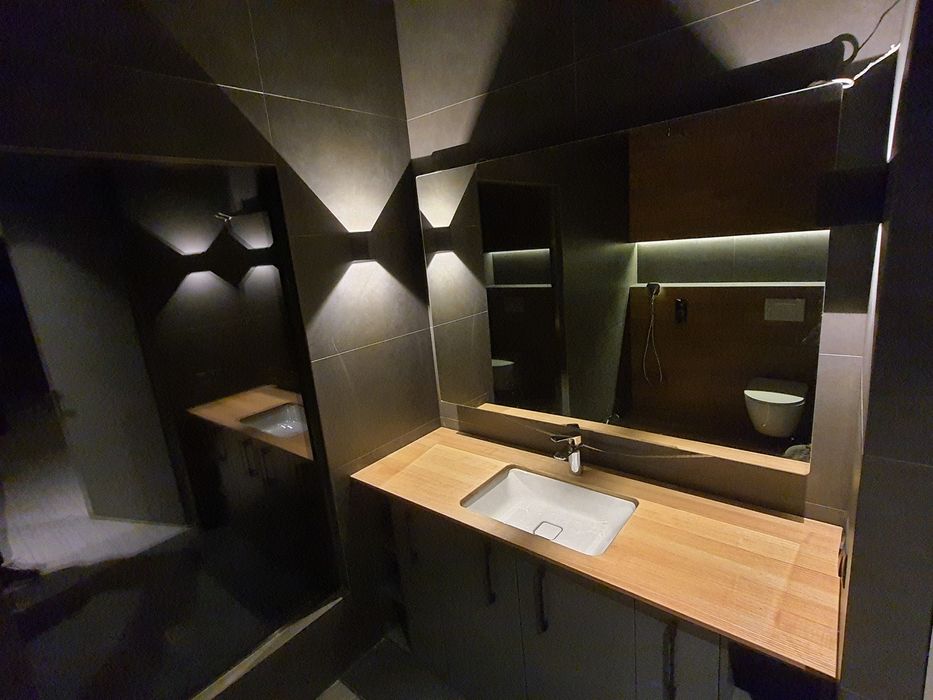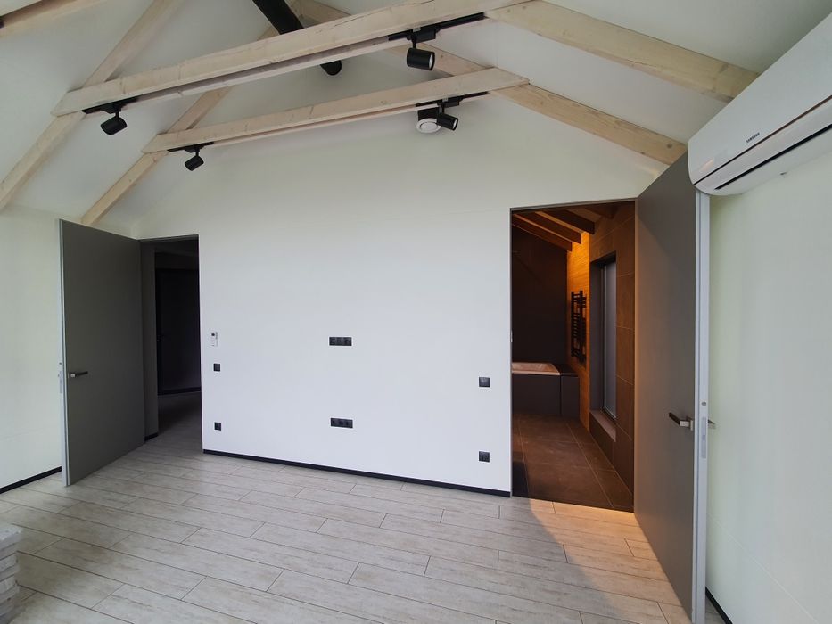 -каркас из калиброванного бруса 200×40 6% влажности, огнеупорной пропиткой, закрыт ОСБ 12 мм и кровельным рубероидом, утеплен напыляемым пенополиуретаном с закрытой ячейкой, установкой высокого дав ления HUNTSMAN (Germany) 200 мм. Внутрен няя отделка - ламинированные листы МДФ 18мм;