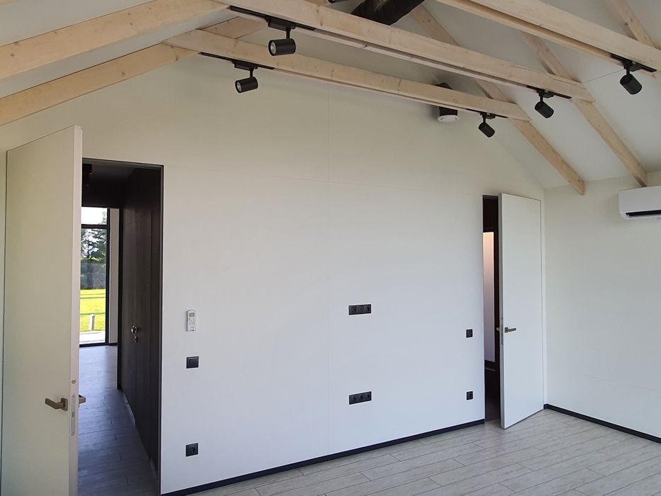 -электроотопление 3 фазы, 24 кВт Vaillant с управляемыми циркуляционными насосами Grundfos ALPHA, прокачивают контура, равномерно распределяя тепло по всему периметру дома, без отопительных регистров;