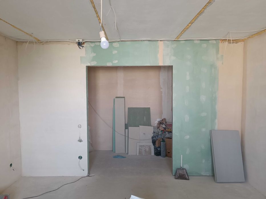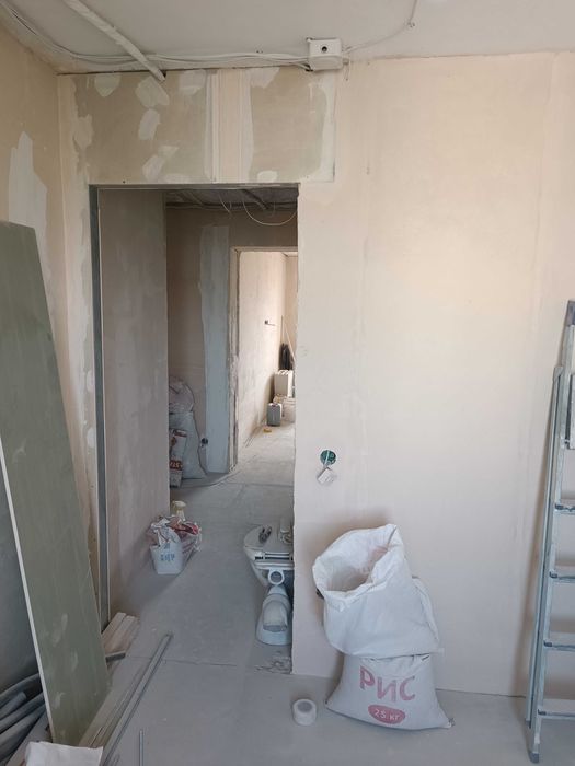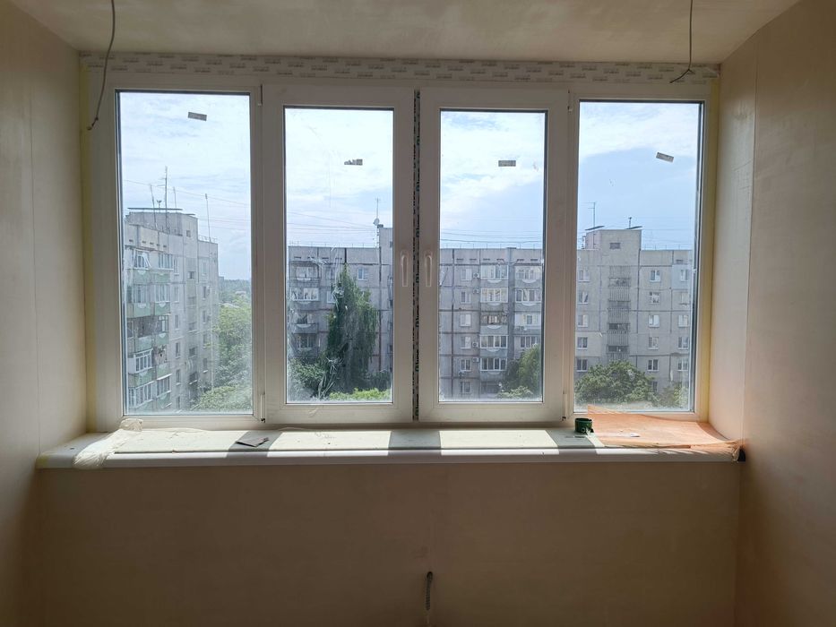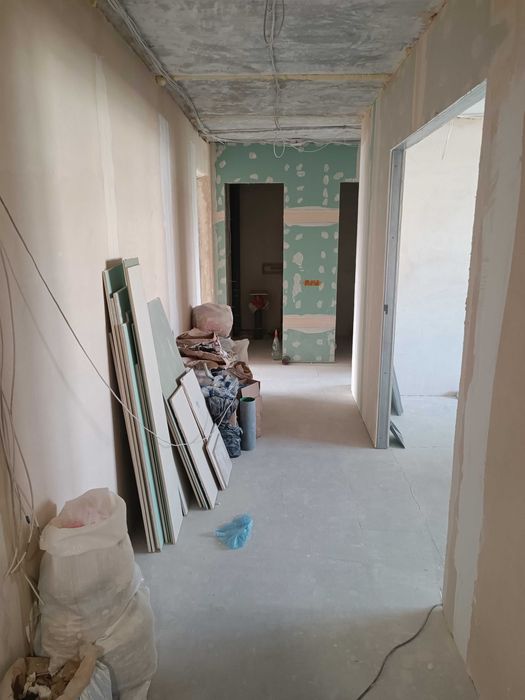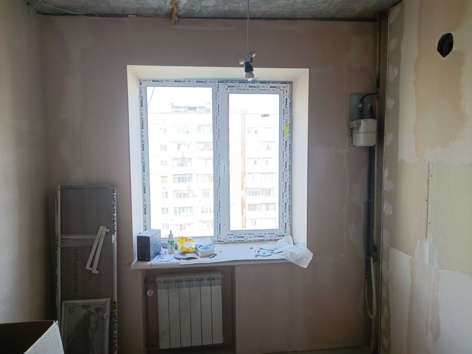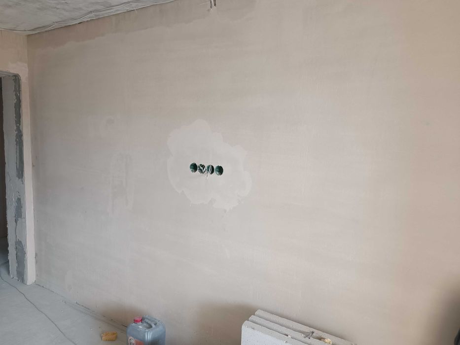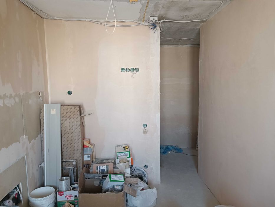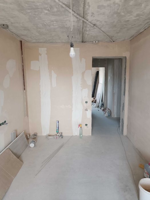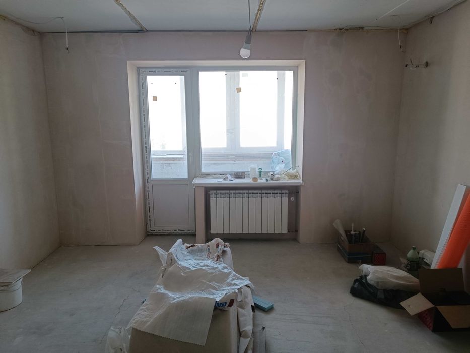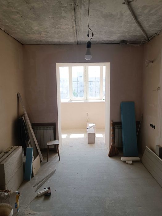 Стяжка в одном уровне по всей площади квартиры,утеплена лоджия,оштукатурены стены во всех помещениях,подготовлены все дверные проёмы,установлены подоконники и откосы на окнах.