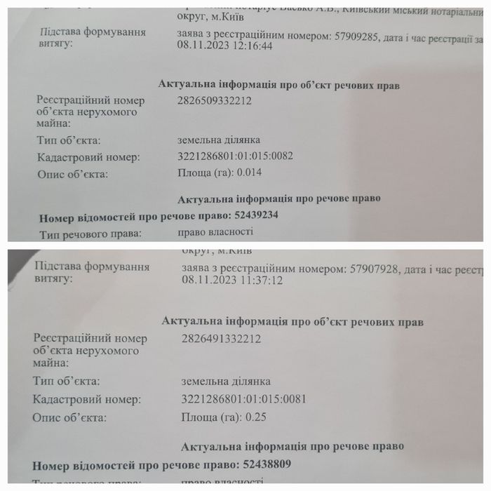 Пухівка Бровари Київська область 26 соток під забудову; Дві суміжні ділянки: 0.25 га під забудову і 0.014 під с/г. Кадастр 2023 р. Скважина. На ділянці недобудова.