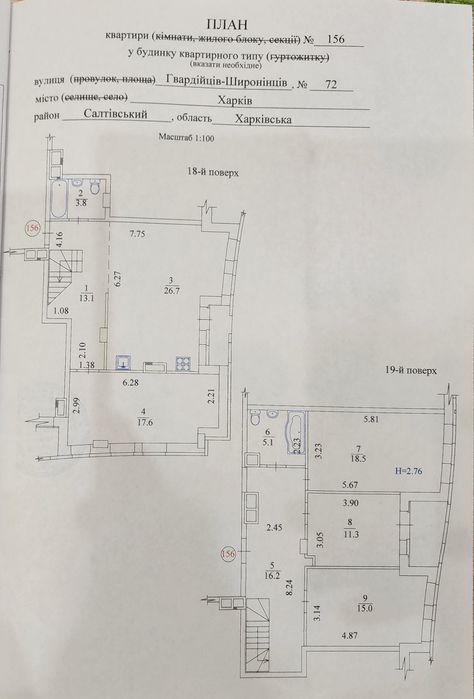 На 18м этаже большая кухня и комната,а также небольшой санузел,а на 19м три спальни и санузел побольше.