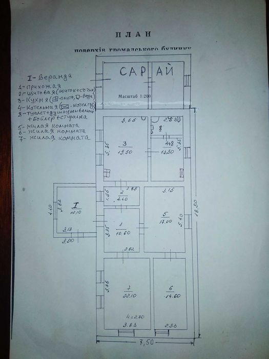 Дом состоит из: веранды, прихожей, три жилые комнаты, большая кухня, щитовая, кладовка-котельная. (См. план дома). Сзади дома большой сарай.
